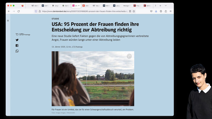 What do abortions look like? What kind of images shape our view on them? And where do these images come from? The desktop essay “getty abortions” examines how German and Austrian media illustrate the topic of abortion, browsing through stock photos, teen magazines and documents of a real abortion experience. It jumps from the early 2000s to the late 19th century, seeks out feminist knowledge and chats with fictional characters. But one question remains: Why does no one look into the camera?